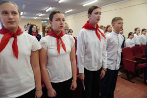 Посвящение началось с выноса знамени"Юнармия" и исполнения Гимна РФ![]()