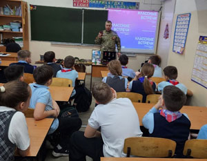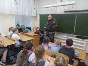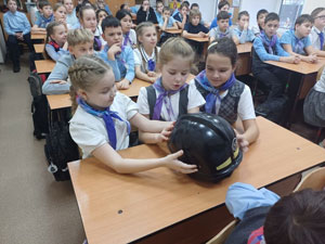 35 лет со дня основания Министерства Российской Федерации по делам гражданской обороны, чрезвычайным ситуациям и ликвидации последствий стихийных бедствий, в рамках Акции "Безопасные каникулы"", в гости к Орлятам 4-х классов пришел начальник караула 55 - Пожарно- Спасательной Части ст.лейтенант внутренней службы Крутов Артем Александрович.