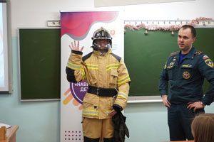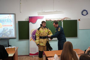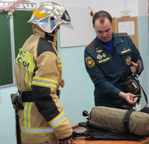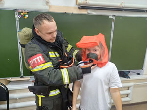 Так же ученикам была продемонстрирована боевая одежда пожарного, снаряжение. Особое внимание ребят привлек дыхательный аппарат, который используют пожарные при тушении пожаров и спасении людей в дыму.Практически каждый ученик смог примерить устройство и ощутить себя в роли спасателя. Было много вопросов, звучали ответы. Несмотря на то, что разговор был серьезный, были и улыбки. Но самое главное, ребята поняли, что безопасность в руках каждого, а для этого надо соблюдать правила, быть внимательным и осторожным.